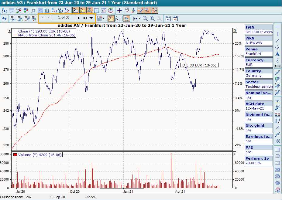 As soon as the chart show is opened, additional arrow icons for scrolling through the chart show are displayed in the toolbar of the chart window. You can also see here how many charts are included and which chart is currently displayed.