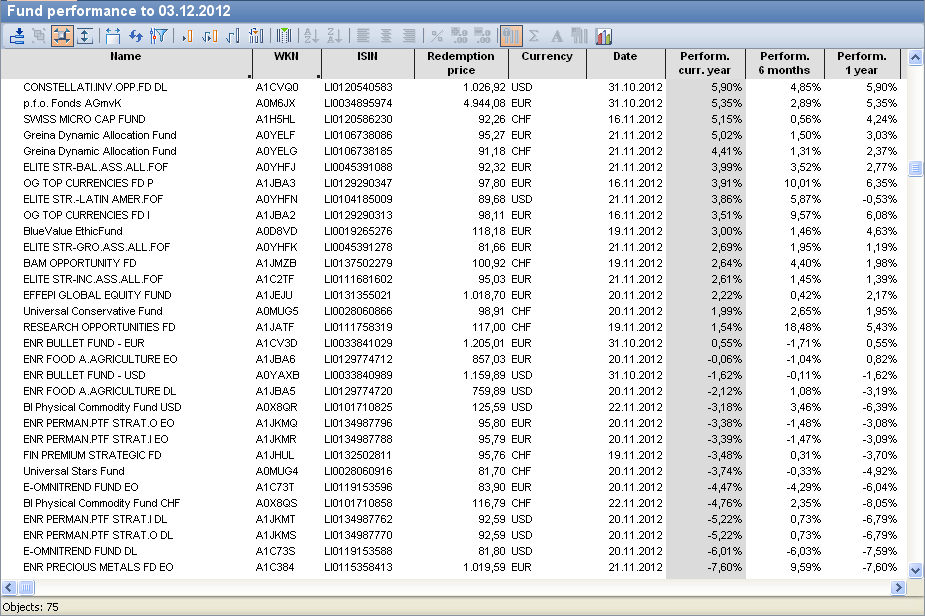 By default, the fund performance is based on the current date. If you do not have any current courses on this day, the table will be filled in with "n/a". In this case, you can enter the evaluation date manually in the parameter settings.