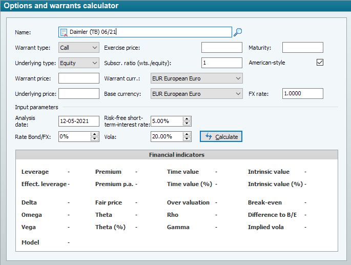 Or search for a warrant using the search function and then open its workspace by double-clicking on it in the search result. In the workspace of the warrant, switch to the "Warrant" worksheet and then to "Calculator". The OS calculator is opened (and in the latter case is already pre-assigned with the current warrant as an input object). To analyze a new warrant or option, enter the name in the "Name" field and search using the "Search" icon to the right of it. The object search is used here to search specifically for options and warrants.