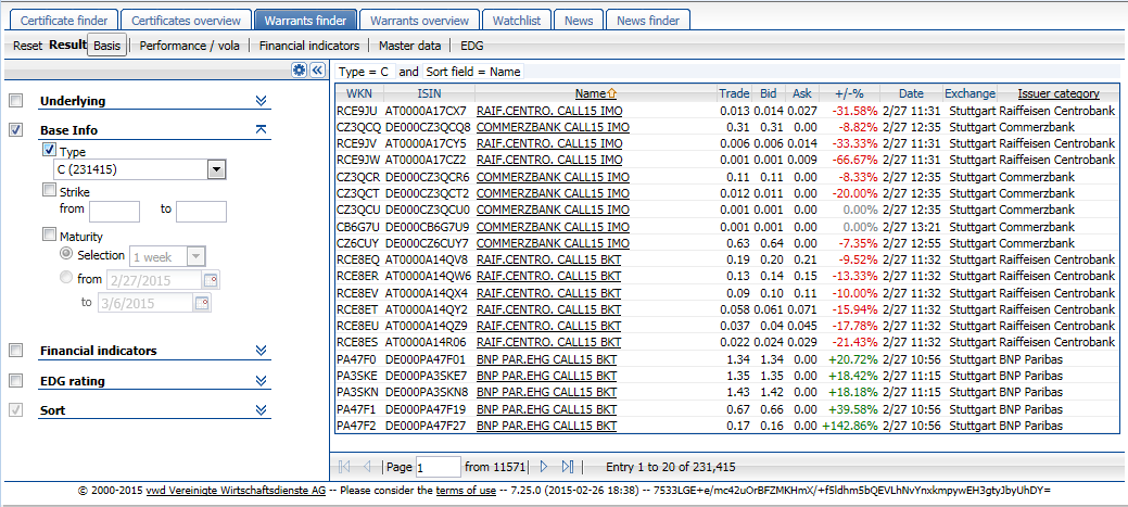 The Warrant Finder also makes searching for warrants quick and easy. The operation of the search mask largely corresponds to the search mask of the Certificate Finder in the Finder Derivatives (Online) described above.