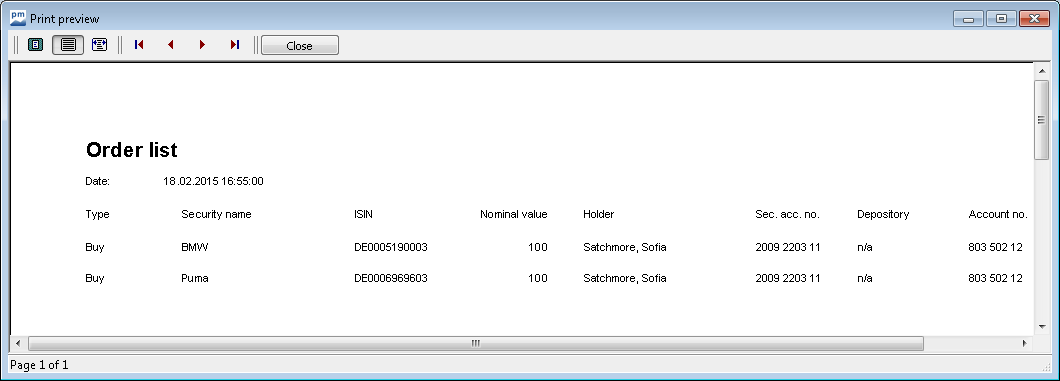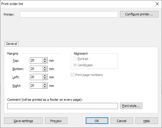 In the "Print order list" dialog box that appears, you can select and configure the printer as usual, define page margins and insert a comment line.