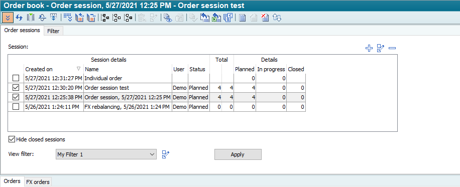 Hide closed sessions | Activated by default. Deactivate this checkbox to also see the order sessions with the order session status "Closed" in the order book. |