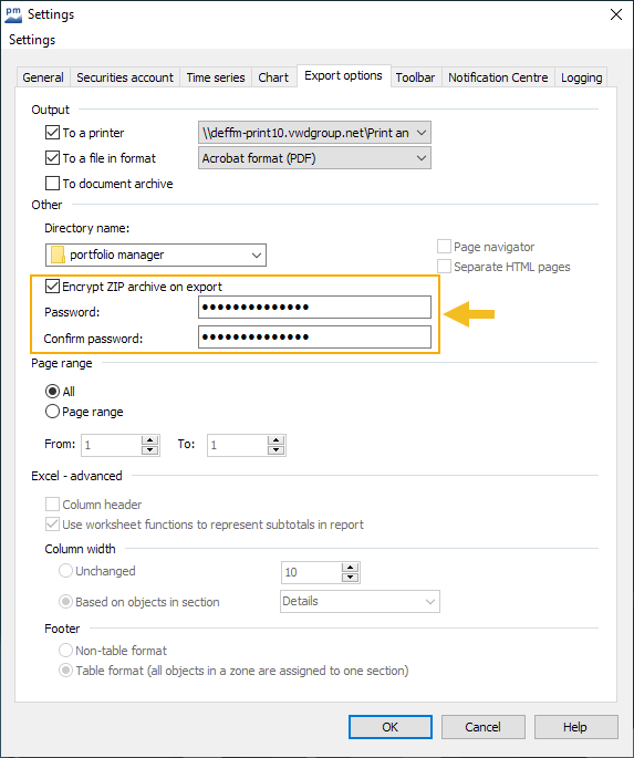 The dialog box closes and the password is saved. The encryption then applies to all subsequent exports to ZIP archives in the batch export, scheduled reporting and loss threshold reporting of this user.