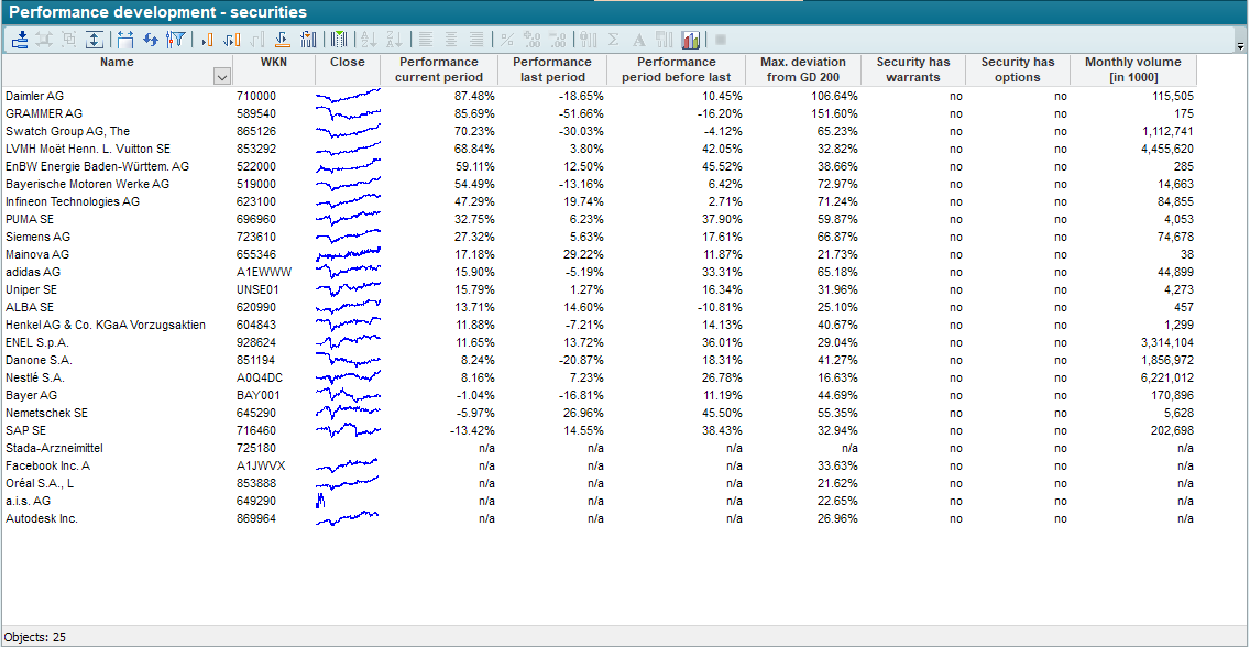 The "Performance development of securities" evaluation is a table that analyzes the price performance for all securities of the input object (e.g. a folder or filter from the Explorer).