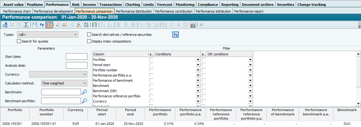Performance | The performance of the comparison portfolio (selected via the parameters) in the set evaluation period. | |