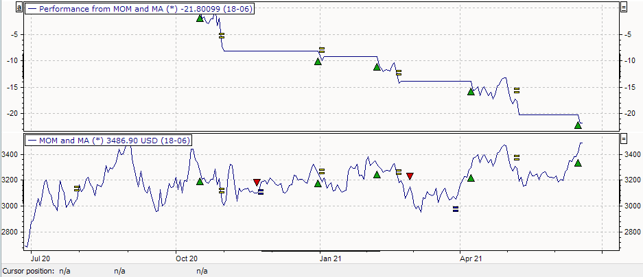 Then click on the "Show performance" icon in the toolbar of the chart window. The performance of the trading system is calculated and displayed in the chart window.