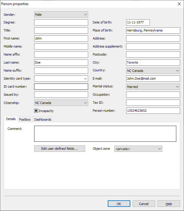 Country | The person's country can be selected in the selection list. The default setting is "n/a". |