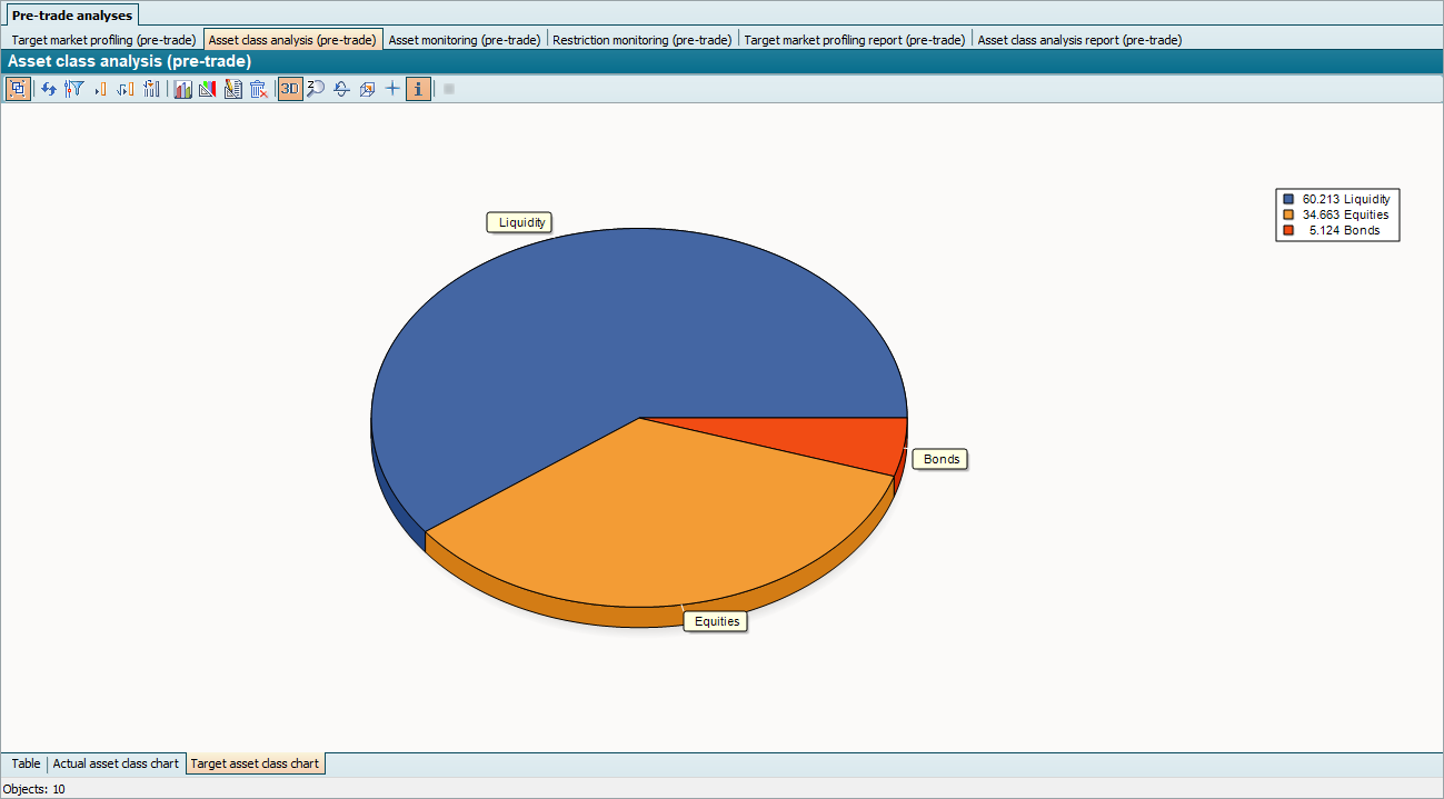 The "Asset class analysis (pre-trade)" opens as a table. In addition, two diagrams are also available for the actual and planned values.
