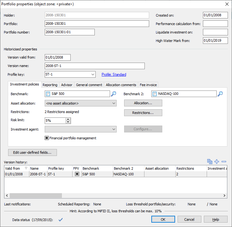 Note: According to MiFID II, the loss threshold for portfolios under financial portfolio management may not exceed 10%. You can check the entered threshold value in the Infront Portfolio Manager using a plausibility check.