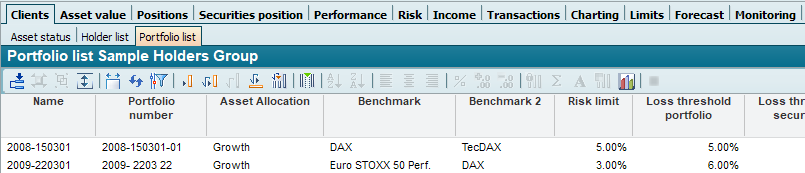 For groups and owners, you can use the portfolio list to list all associated portfolios and their master data. You can find the portfolio list, for example, in the workspace of groups under the "Customers" worksheet: