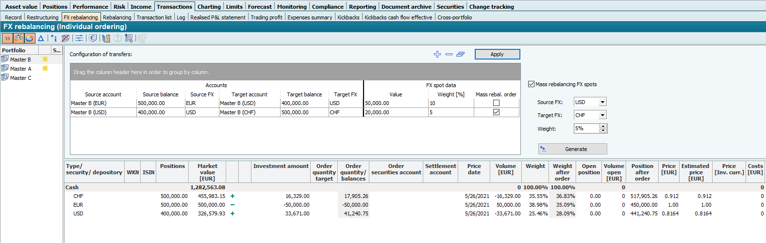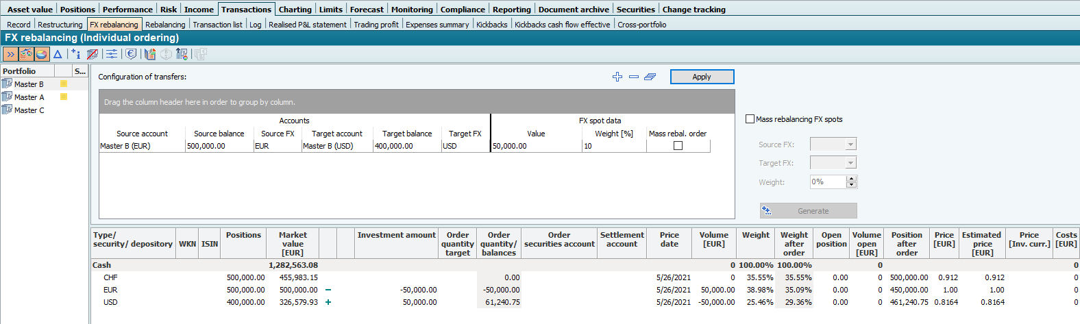 Several portfolios can be involved in one order in "Currency rebalancing" mode. In the position overview, however, only the positions of the portfolio currently selected in the portfolio list are displayed and updated using the "Apply" button.