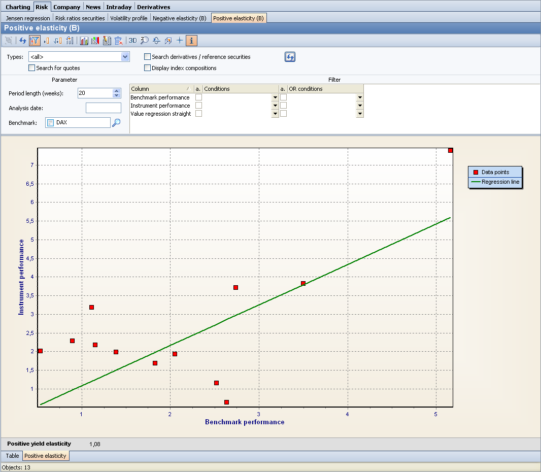 This evaluation provides both a table and a graphic for visualizing the positive elasticity, which opens by default. Use the familiar tabs at the bottom of the evaluation window to switch between table and graph view. You can find the evaluation in the securities workspace on the "Risk" worksheet.