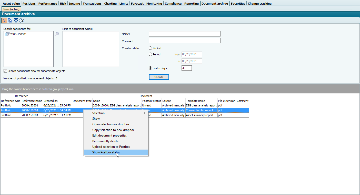 - In the context menu of the document, select the SHOW POSTBOX STATUS command from the list. (This command is only visible in useful cases)