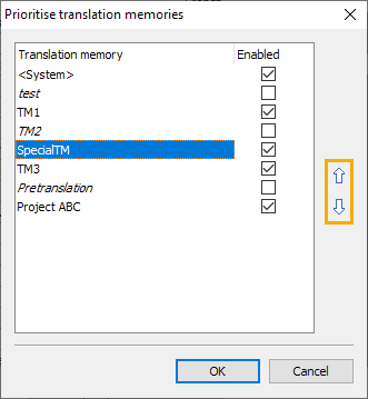 - In the "Prioritize translation memories" dialog box that appears, use the arrow icons on the right-hand side to specify the order and thus the prioritization of the available translation memories.