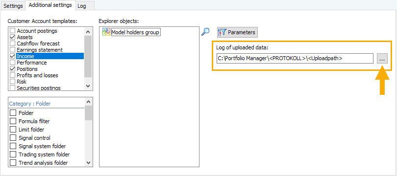 - Configure your log of uploaded data here. First define the output directory in the upper input field. Use the button to the right of the input field to open the Explorer to select the desired folder.