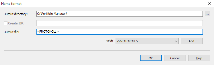 Use the prepared field <PROTOCOL> to automatically assign a meaningful name. You can (re)insert the field into the "Output file" input field at any time using the "Add" button.- Close the "Naming scheme" dialog box with "OK" once the configuration is complete.