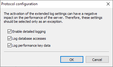 Use the CONFIGURE LOGGING command in the main menu to open the "Log configuration" dialog box, in which the logging settings of the server can be influenced at runtime. This allows more data to be collected for analysis purposes, for example. With the exception of performance data, the data is logged in the usual log files.