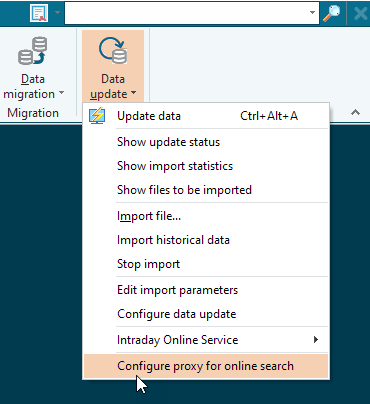 - Select the command CONFIGURE PROXY FOR ONLINE SEARCH on the "Data maintenance" tab in the menu of the "Data update" icon in the Infront Portfolio Manager ribbon.