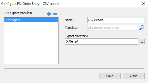 The "PSI Order Entry - Configure CSV export" dialog box appears.