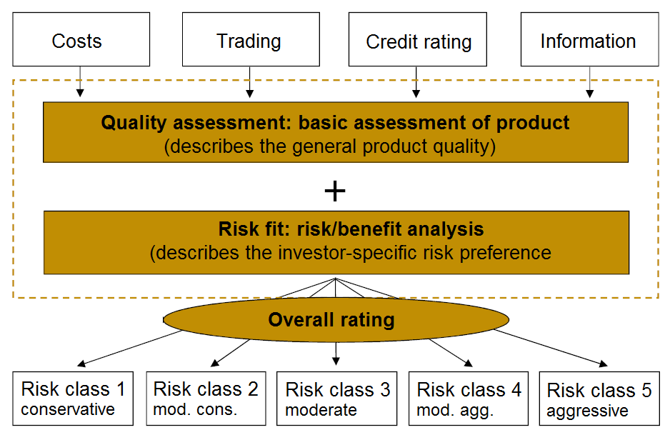 All relevant criteria that influence the product quality of certificates are taken into account. Finally, the quality assessment and the risk fit are combined to form an overall assessment of the suitability of a product for the respective investor.