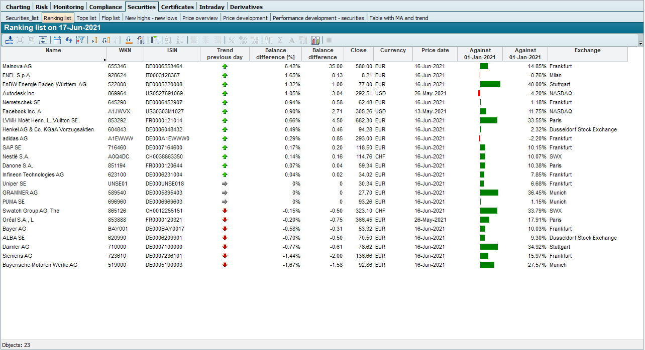 The ranking list is a table that lists all securities of the input object (e.g. a folder or filter from the Explorer). The securities are sorted according to their percentage price difference compared to the previous day, i.e. the security with the largest price increase in percent compared to the previous day (or the last trading day) (or the smallest price loss in percent if all are in the red) is at the top.