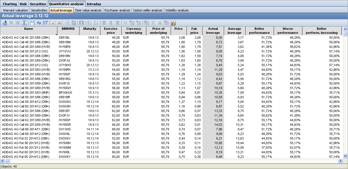 Real leverage | The real leverage indicates the average performance of the warrant in comparison to the underlying asset during the analysis period. If the real leverage is greater than one, this means that the warrant has outperformed the corresponding share. |