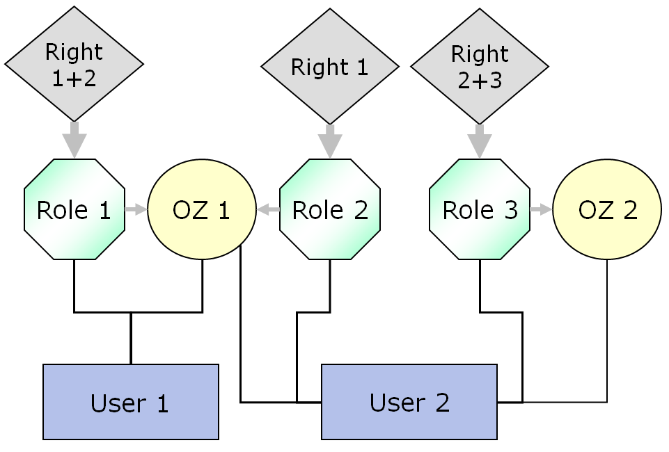 In this example, you can see the simplified interaction of users, object zones, roles and the rights assigned to the roles. "User 1" is assigned to "Role 1" and "OZ 1". In the example, he receives "Right 1" and "Right 2" at "OZ 1" via "Role 1". "User 2" has "Right 1" to "OZ 1" via the "Role 2" assigned to him. In the object zone "OZ 2", on the other hand, he assumes "role 3" and therefore has the rights "right 2" and "right 3" in this zone.