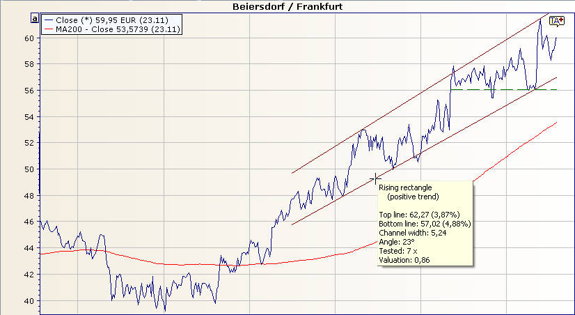 A rectangle generally consists of a support line and a resistance line. The course fluctuates several times between these two lines, but without clearly leaving the channel. Normally, this is a sign of a sideways movement, which only ends when the upper or lower line is broken through.