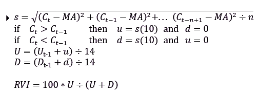 The RVI ranges between 0 and 100, the center line is 50. As the calculation of this RVI is not trivial, we do not provide a precise derivation here. Readers interested in mathematics can take a closer look at the formula below.