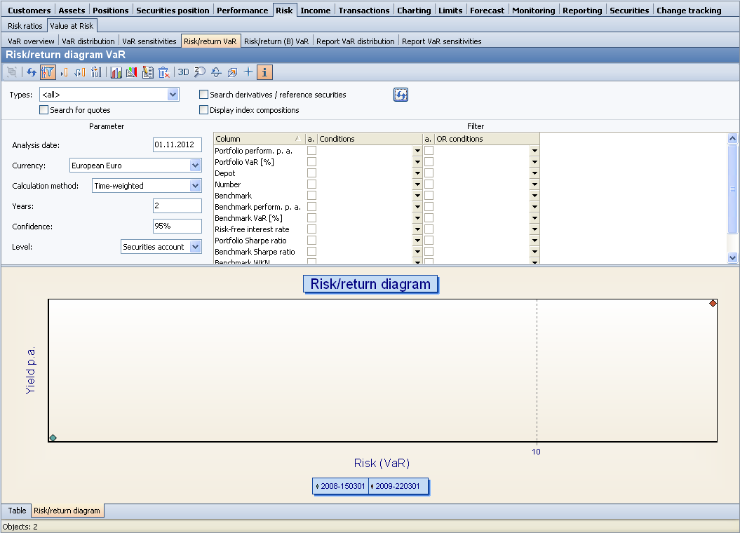 This evaluation is structured in the same way as Risk-return diagram , except that the risk here is measured using the VaR instead of the volatility. The VaR is calculated by considering the portfolio as a fund.