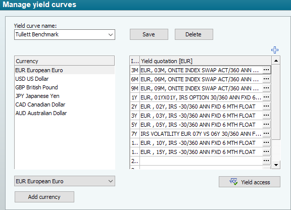 The scenario analysis is essentially based on a yield curve for government bonds for each currency. The required market data (yield values) should be taken from specific quotations provided by a yield time series (e.g. in the historicized spot or open interest field). The configuration of the yield structure data now links such quotations with the assigned currency and curve grid point.