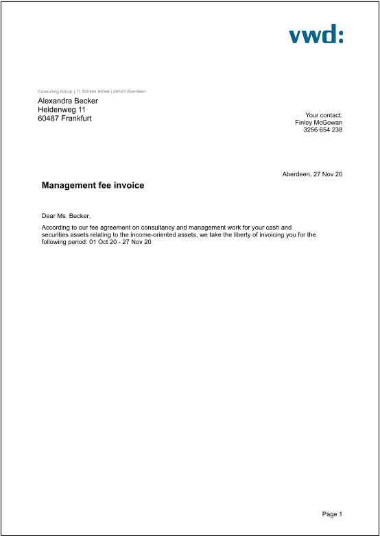 Plus VAT 19,00% | [Only visible if the "Add VAT" parameter is activated] The resulting VAT (according to the VAT rate from the system settings) on the asset management fee. |
