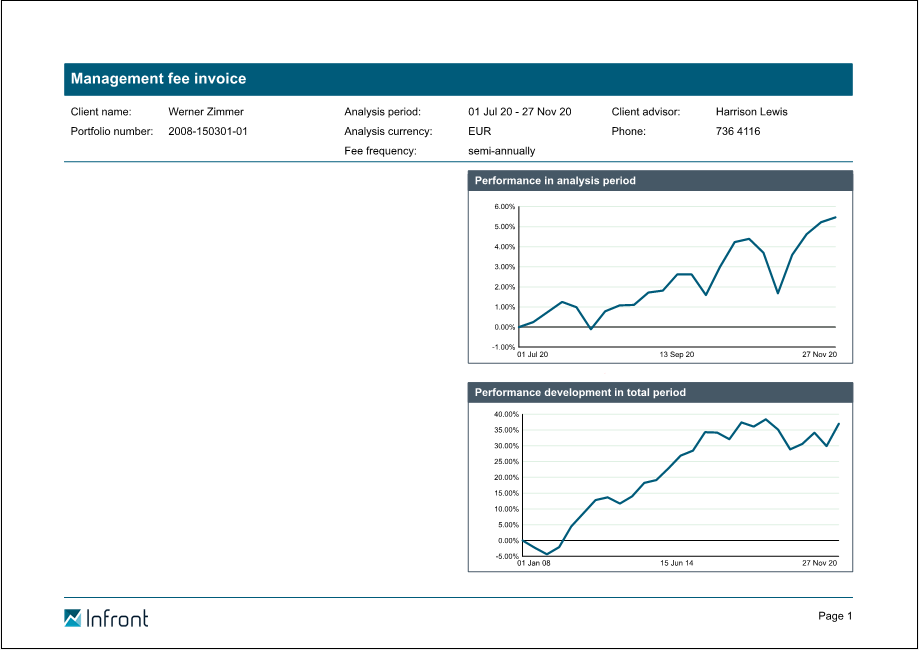 The "Fee invoice extended with graphic" report accesses the master data for the fee invoice described in the section Portfolio properties .