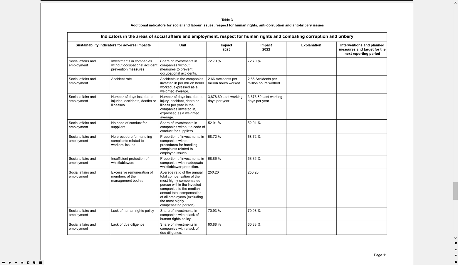 The indicators listed here can also be found in the following Table 3 "Additional indicators for social and labor issues, respect for human rights, anti-corruption and anti-bribery matters". You can show and hide the indicators using the T3 parameters of the report . Please note that you must list at least one of the indicators available in this category. - Description of the strategies for identifying and weighting the main adverse impacts on sustainability factors [Article 7 information]