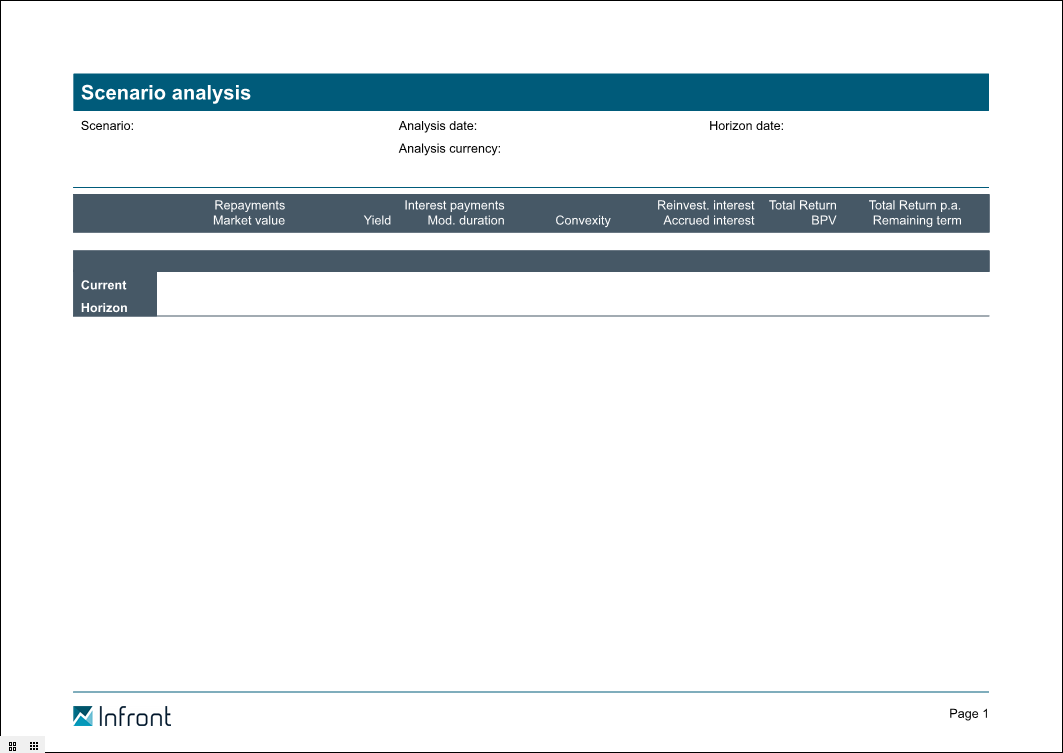 In addition to the key figures from the"Portfolio overview scenarios" report, the "Portfolio overview scenarios extended" report provides further data on all portfolio variants such as accrued interest, BPV or residual term or credit spreads. If necessary, read the section Portfolio overview scenariofor the individual key figures.
