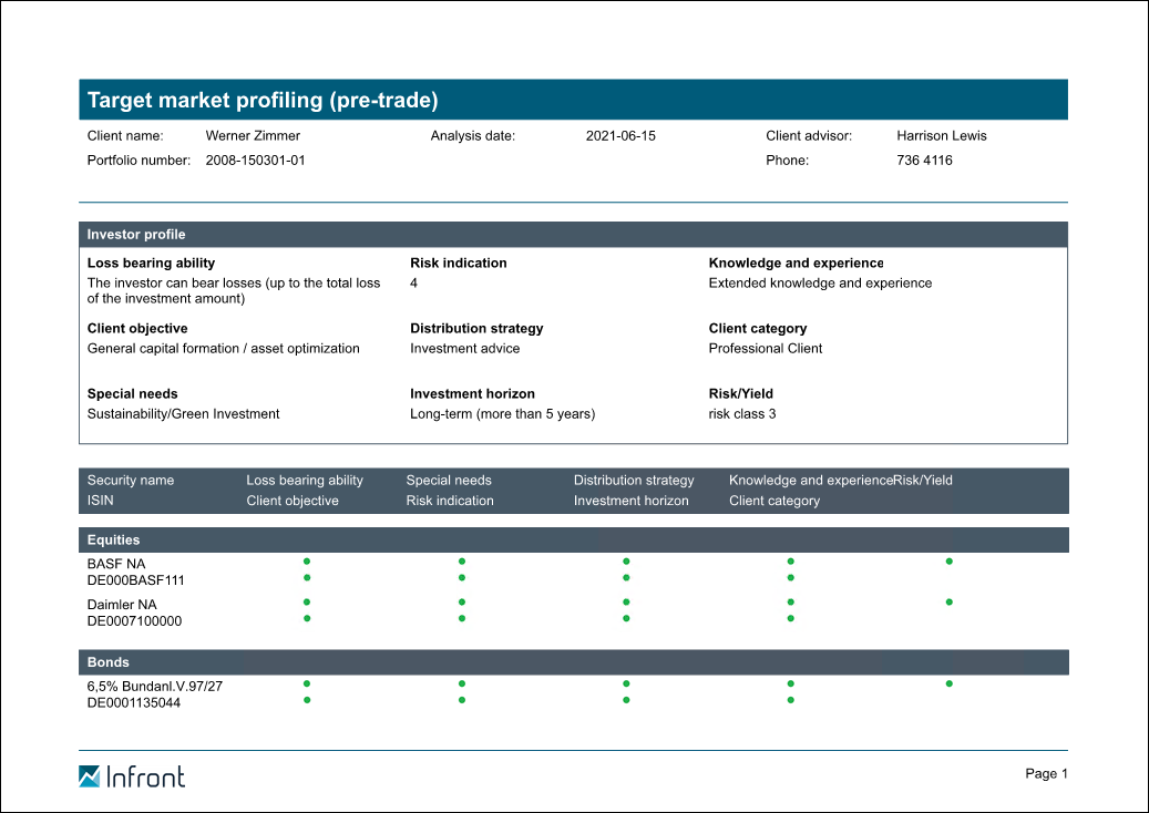 This report uses the target market service to compare the stored investment profile with the target market categories of the individual securities in the rebalancing portfolio. In the default setting, only the negative target market is cross-checked. Information on this appears at the end of the report.