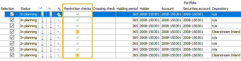 When saving an order session in portfolio rebalancing, any restriction violations are also saved with the orders. These take into account the different levels at which these restrictions can be assigned - portfolio, owner and (possibly several) group levels. All restrictions are displayed in the order book. They can be checked and provided with comments. The following information is available in this context: