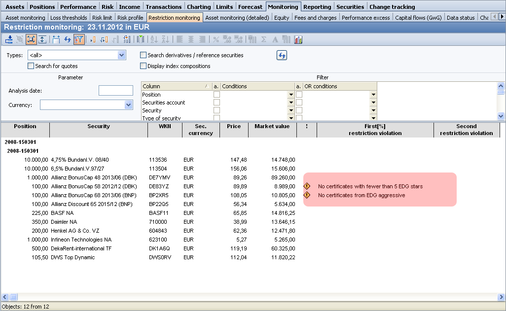 You can also define any number of additional restrictions and assign them to your portfolios. If necessary, read the chapter Restrictions.