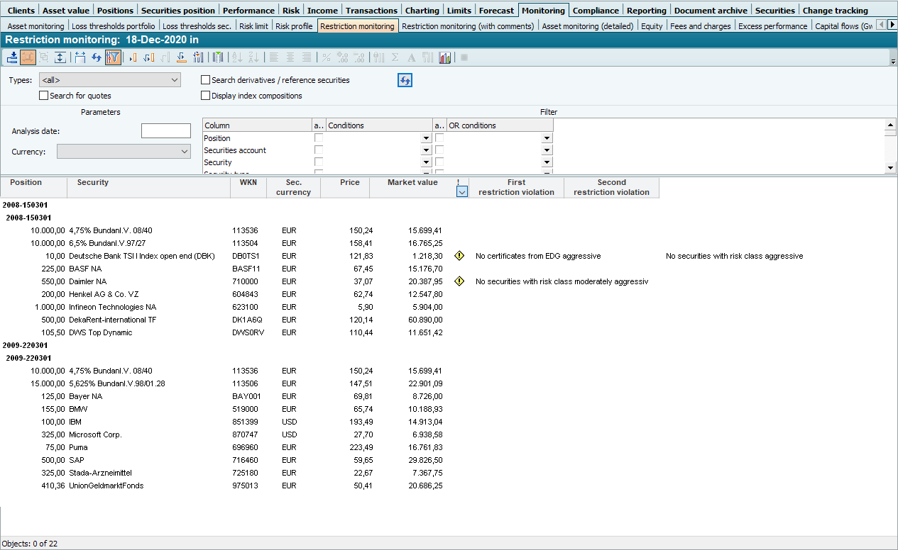 Restriction monitoring shows you up to two violated restrictions for all securities positions per securities account. To define such restrictions, read the chapter Restrictions.