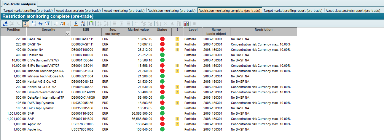In the pre-trade evaluations, you will find the "Restriction monitoring complete (pre-trade)" evaluation, which provides you with a perfect overview of all relevant restrictions.