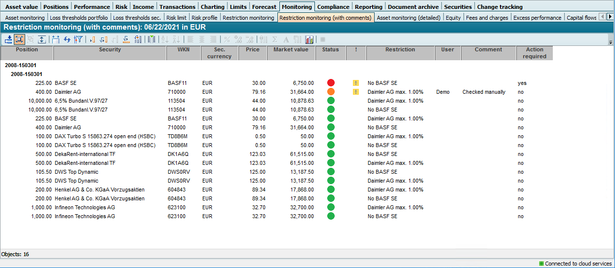 If there is no comment at the time of evaluation, the columns "Status changed", "Already processed", "User" and "Comments" are displayed as empty in the "Restriction monitoring" evaluation. The sorting in this case is first by status ("traffic light"), then by "Action required" and finally by security/position. This places entries at the top for which an action is required.