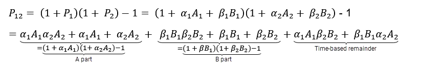 The temporal remainder now consists of the terms that do not clearly belong to either A or B. This means that the sum of the performance contributions over several periods is only equal to the total performance if the temporal remainder is 0 (which almost never occurs).