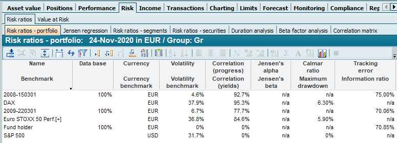 This analysis presents the key risk figures at portfolio level. You can find the evaluation in the workspaces of portfolios, groups or holders on the "Risk" worksheet, "Risk indicators"