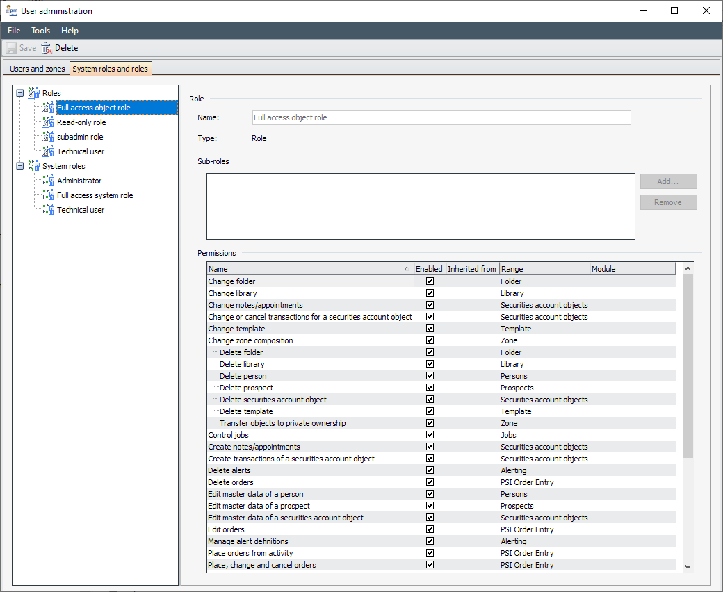 Sub-rolls | Use the "Add" button to assign so-called sub-roles to the currently selected role. If necessary, you can remove this assignment of roles again via "Remove". |
