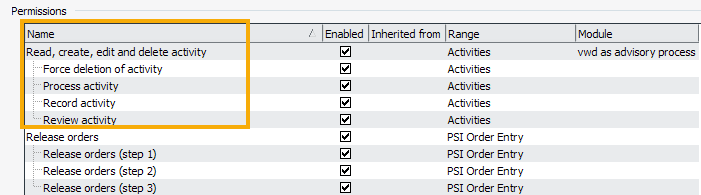 In the image above, for example, the "Process activity" right is subordinate to the "Read, create, edit and delete activity" right.