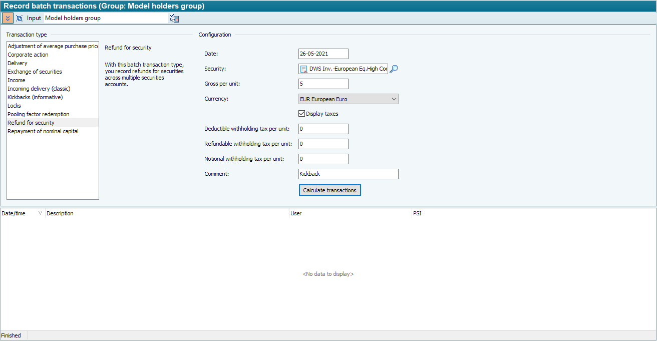 If you have selected the collective transaction type "Refund security" with the mouse, you will see the following elements to the right of it in the "Configuration" area: