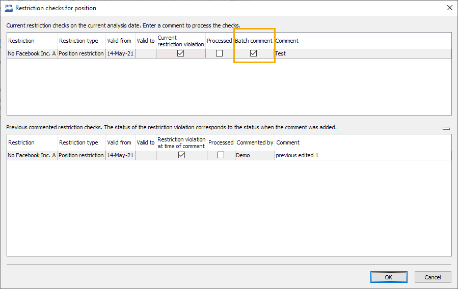 In the "Position restriction checks" dialog box, you can decide for an entered comment whether it should apply to several positions in a portfolio. You will find the "Collective comment" column in the upper table of the dialog window. If you activate the checkbox for a restriction in this column, the comment is added to every position in the portfolio with this restriction and the same restriction violation status.