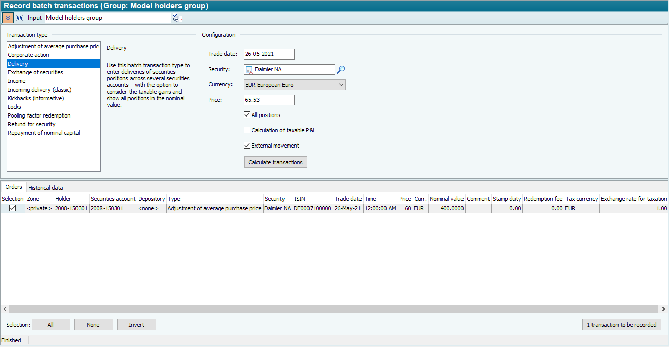 Enter the desired data - date, security - in the "Configuration" area to the right. For details on the configuration of the individual transaction types, see the following sections.