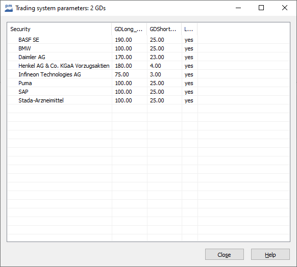 The current assignment of the variables can be displayed and edited manually using the variable dialog. The dialog box shows a list of all securities for which individual parameter settings exist.