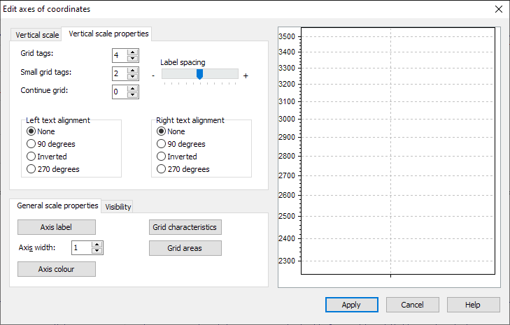 - Switch to the "Vertical scale properties" tab or the "Horizontal scale properties" tab. The current settings are displayed.